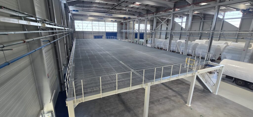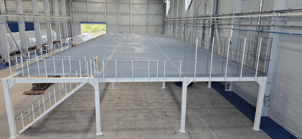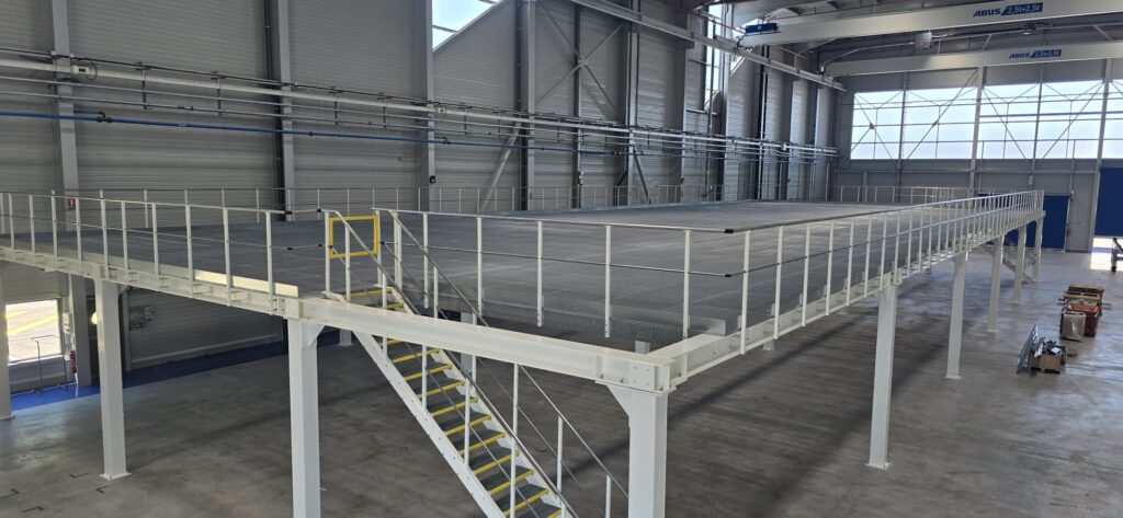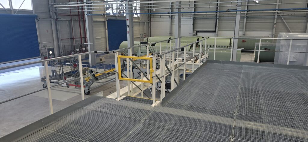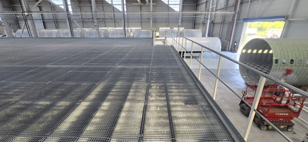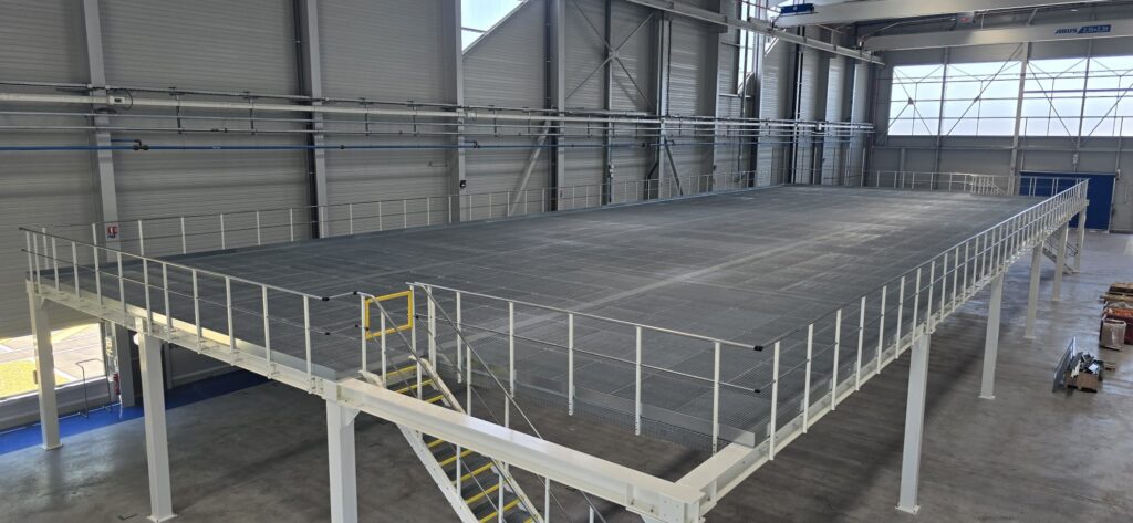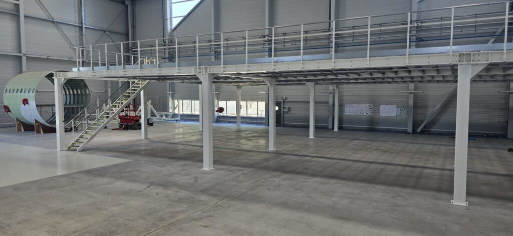 Der Zwischenboden hat eine Bodenhöhe von +6.770 mm und ist mittels Portalen stabilisiert, um maximale Festigkeit zu gewährleisten. Durch die Kombination von warm- und kaltgewalzten Stahlprofilen wurde eine zuverlässige Konstruktion geschaffen, die den strengen Anforderungen der Luft- und Raumfahrtindustrie entspricht. Der offene Gitterrostboden sorgt für eine sichere und zugängliche Arbeitsumgebung mit optimaler Belüftung und Lichtdurchlässigkeit.