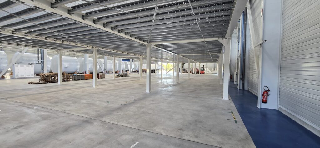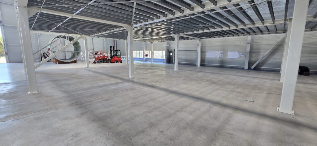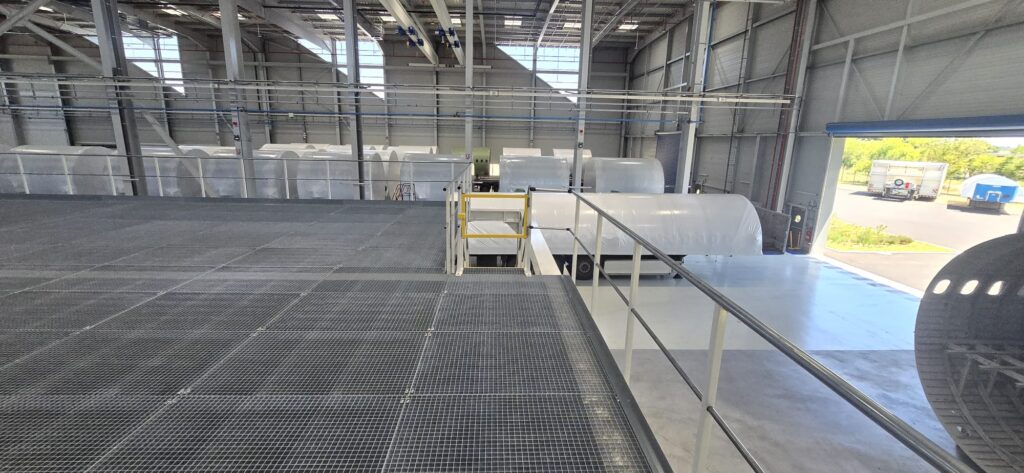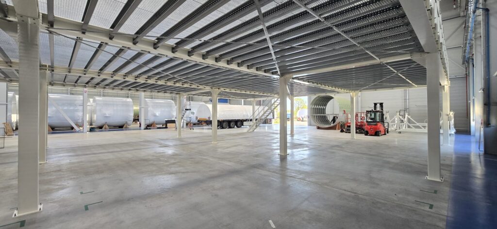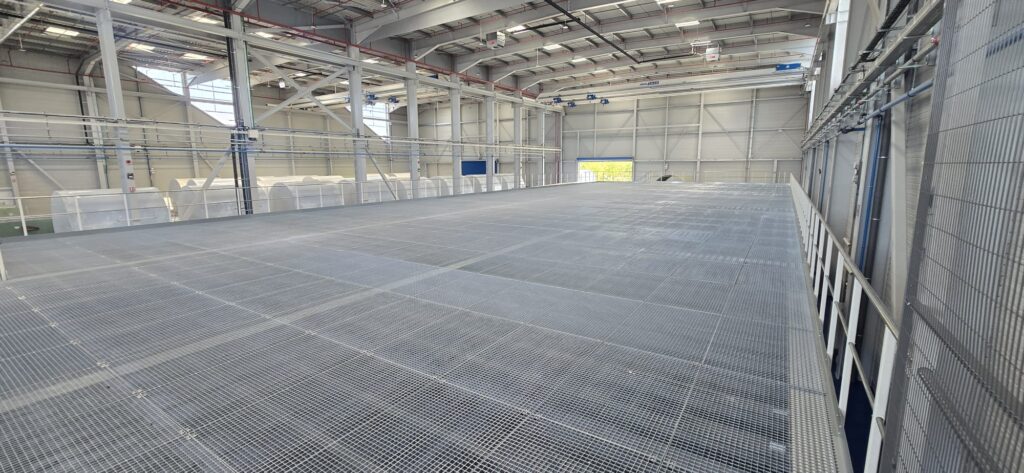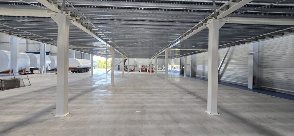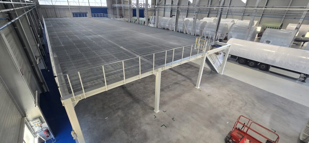Der Zwischenboden hat eine Bodenhöhe von +6.770 mm und ist mittels Portalen stabilisiert, um maximale Festigkeit zu gewährleisten. Durch die Kombination von warm- und kaltgewalzten Stahlprofilen wurde eine zuverlässige Konstruktion geschaffen, die den strengen Anforderungen der Luft- und Raumfahrtindustrie entspricht. Der offene Gitterrostboden sorgt für eine sichere und zugängliche Arbeitsumgebung mit optimaler Belüftung und Lichtdurchlässigkeit.