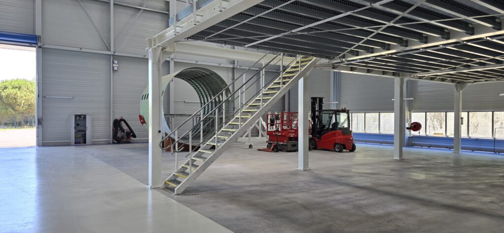Für Airbus in Frankreich entwarf und realisierte Nolte Mezzanine einen Zwischenboden mit einer Gesamtfläche von 794 m². Die Konstruktion besteht aus einer Kombination von warm- und kaltgewalzten Profilen mit einem Stützenraster von etwa 6.000 x 4.600 mm und einem Gitterrostboden. Durch das maßgeschneiderte Design nutzt Airbus die verfügbare Fläche von 1.300 m² jetzt optimal: der Boden verdoppelt die nutzbare Fläche auf 2.600 m² und erhöht damit die Lagerkapazität für Flugzeugrümpfe erheblich.