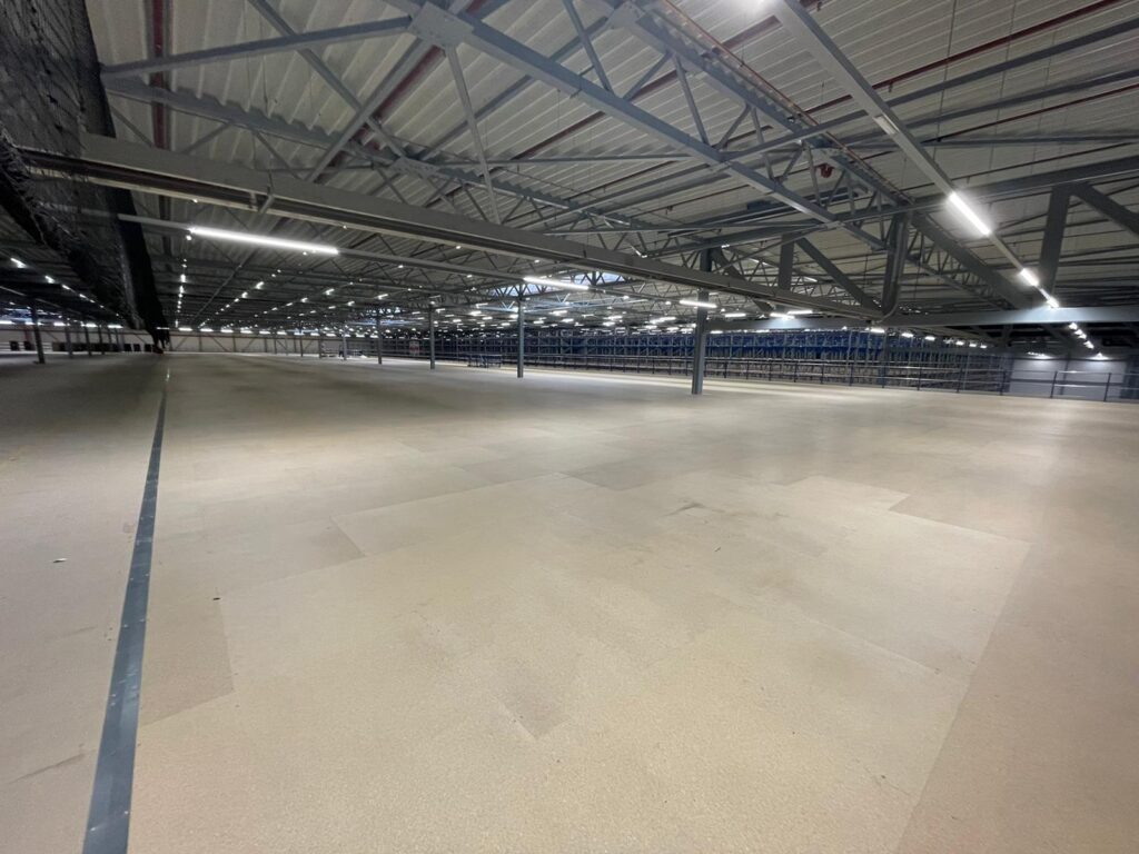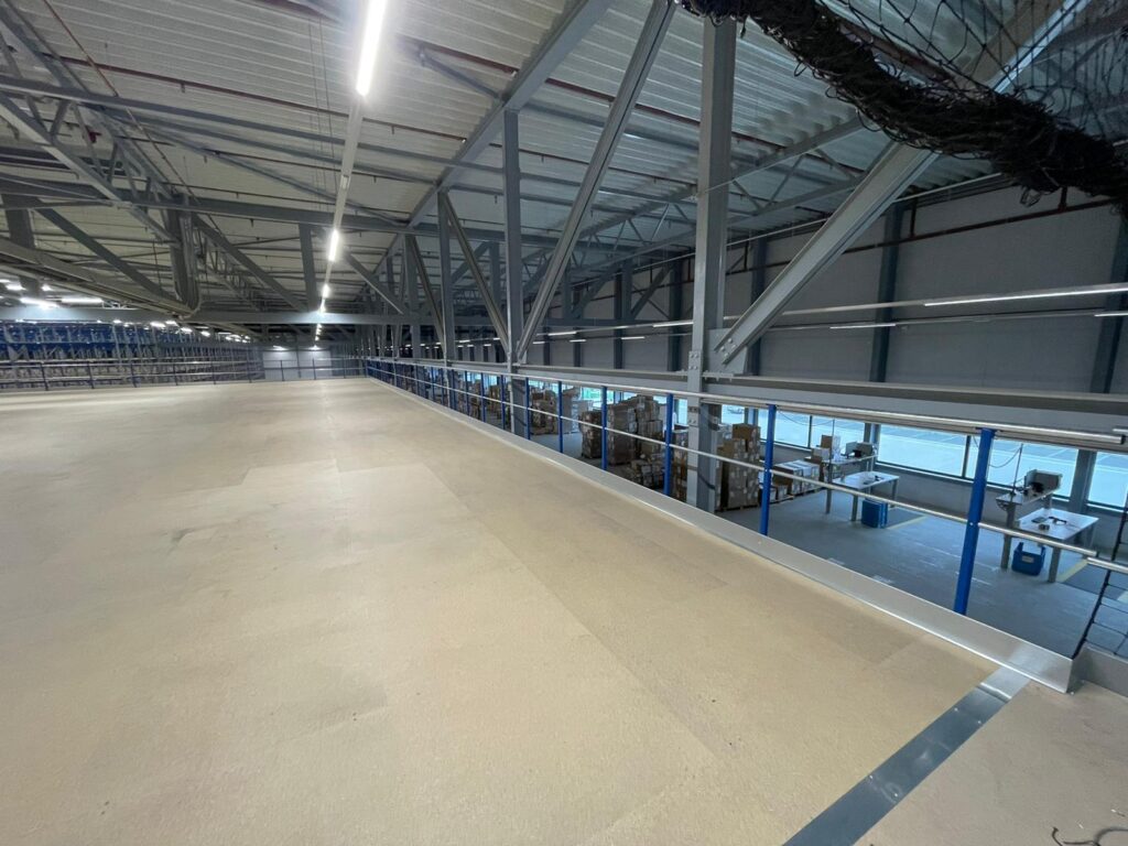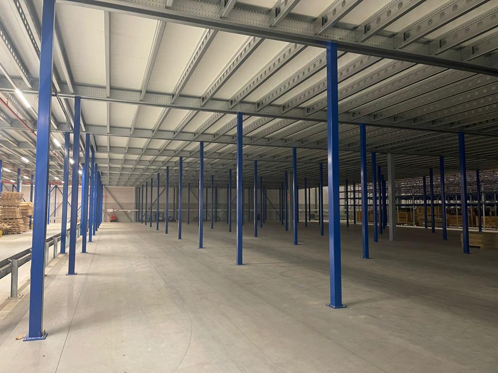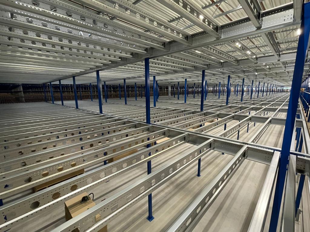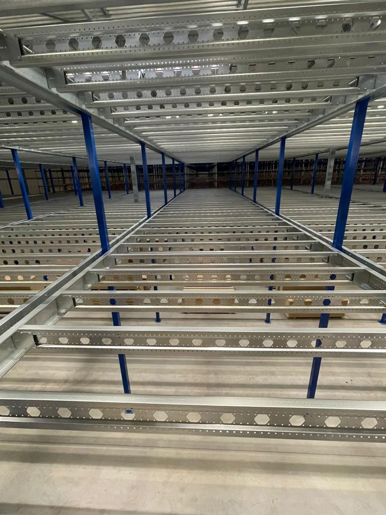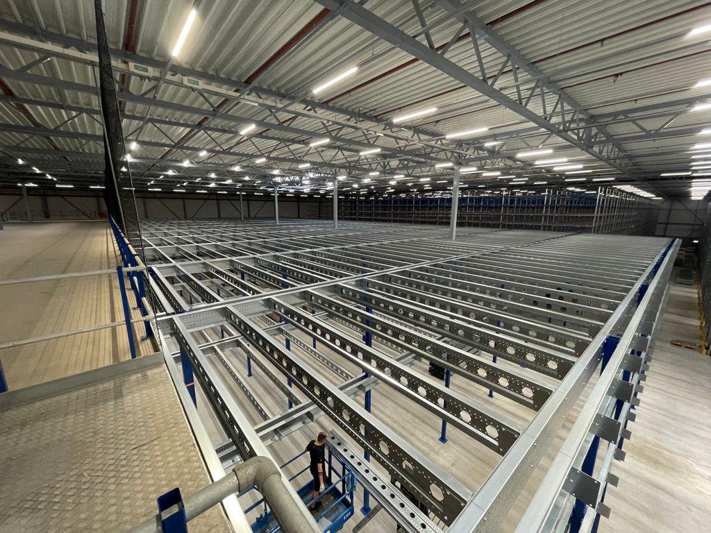 Die Mezzanine wurde aus kaltgewalzten Profilen mit einem Stützenraster von ca. 5.000 x 4.500 mm gebaut und mit einem Spanplattenboden versehen. Mit Geschosshöhen von +4.968 mm und +8.000 mm und Stabilität durch Portale ist die Konstruktion für den intensiven Einsatz als Lager- und Picking-Turm geeignet. Diese Lösung kombiniert zusätzliche Kapazität mit einer effizienten und sicheren logistischen Struktur.