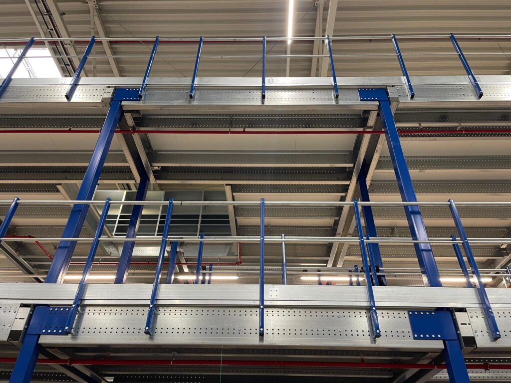 Die Mezzanine wurde mit kaltgewalzten Profilen und einem Stützenraster von ca. 5.000 x 6.000 mm gebaut. Die Spanplattenverkleidung und die Stabilität durch Portale sorgen für eine robuste und sichere Konstruktion. Mit Geschosshöhen von +3.245 mm und +6.445 mm bietet die Mezzanine ausreichend Kapazität sowohl für Lagerung als auch für Fördertechnik. Dieses Konzept macht das Distributionszentrum effizienter und skalierbarer.