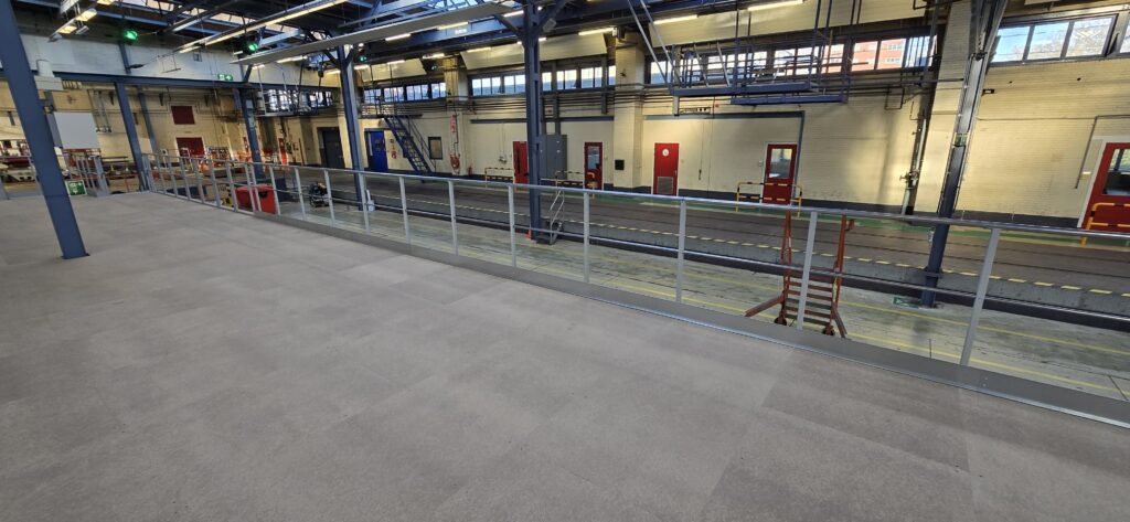 Der Zwischenboden wurde auf einer Höhe von +1780 mm errichtet und mit Kreuzstreben stabilisiert, um maximale Festigkeit zu gewährleisten. Durch die Verwendung von kaltgeformten Stahlprofilen und einer Spanplattenoberfläche entstand eine solide und sichere Konstruktion. Speziell für die Wartung von Zügen entwickelt, kann das demontierbare System zukünftig problemlos angepasst oder erweitert werden.