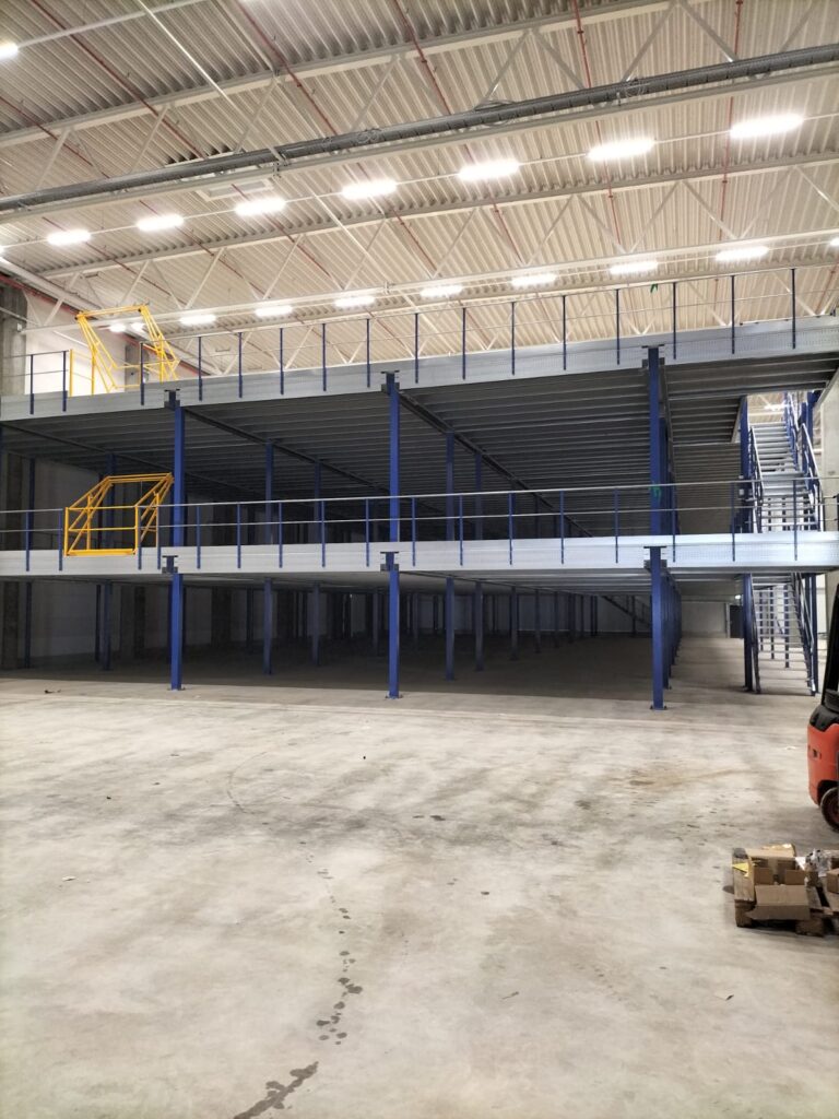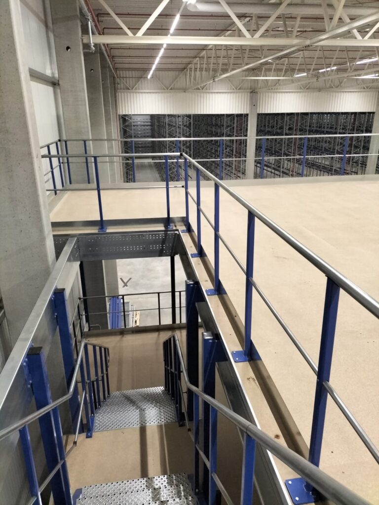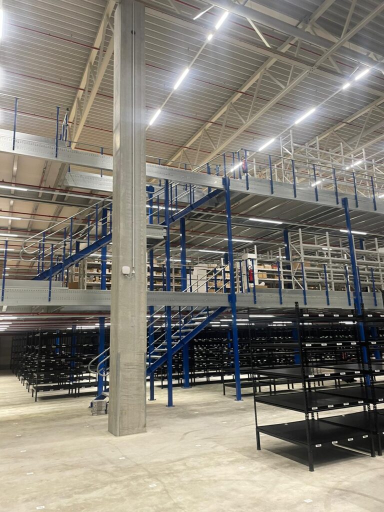 Die Mezzanine wurde aus kaltgewalzten Profilen mit einem Stützenraster von ca. 5.000 x 5.300 mm gebaut und mit Spanplattenboden versehen. Mit Geschosshöhen von +2.600 mm und +6.796 mm sowie Stabilität durch Portale und Kreuzverbände ist die Konstruktion robust und für den intensiven Einsatz geeignet. Diese Lösung nutzt die verfügbare Höhe optimal aus und bietet dem Kunden maximale Lagerkapazität.